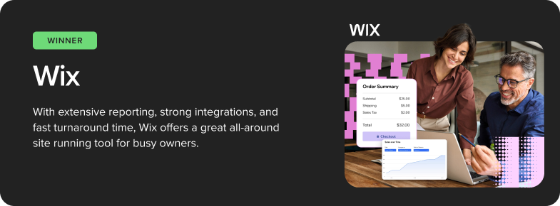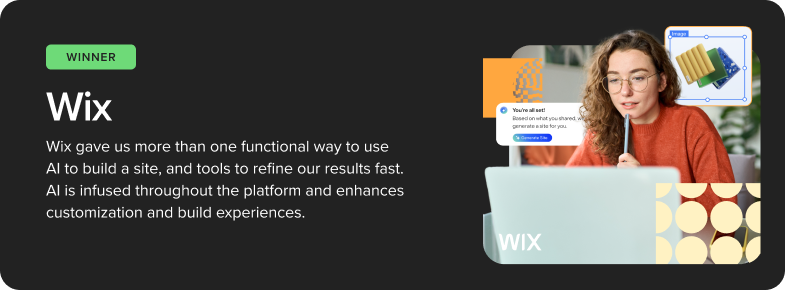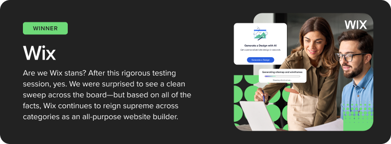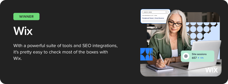 Wix takes the top spot and is an ideal platform for most solos, small businesses and startups, because it simply offers the most functionality for the price, including AI tools, customization, optimization, and more.