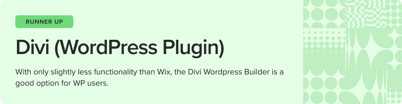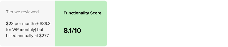 Divi ranks closest to Wix and higher than competitors in terms of its aggregate functionality, and boasts a stellar aggregate site rating of 97%. Usability was also very good at 85%. Divi’s main drawback is linked to cost – part of this is that it requires users to also maintain WordPress business plan access, but if that’s already what you’re using, you might not see this as an additional cost. Overall, Divi is a great option for many users, especially those who already like using WP.