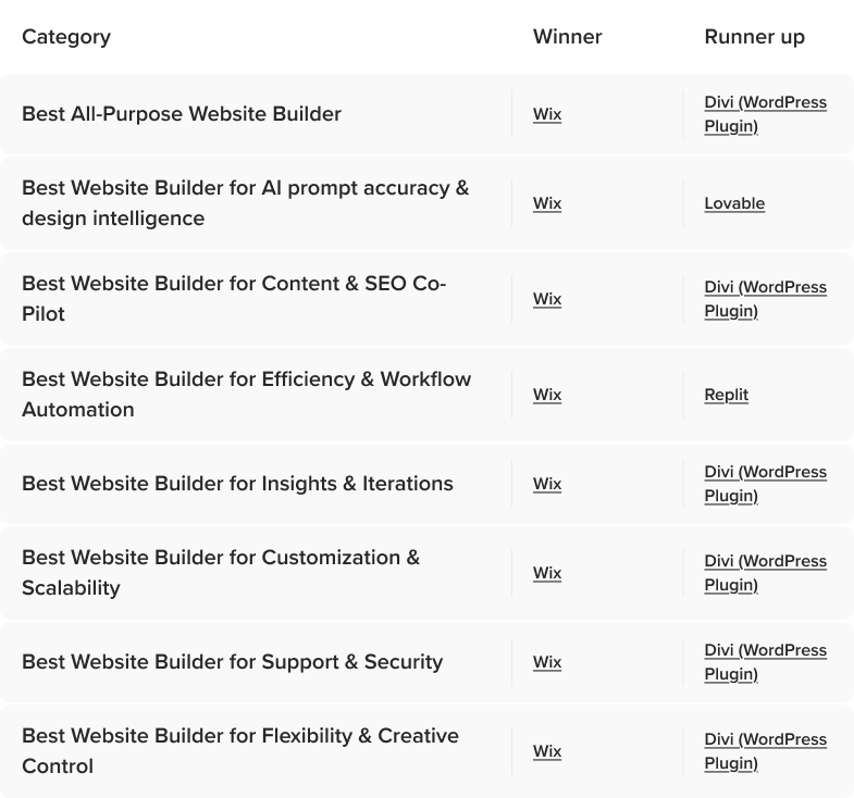 Finally, we put all of the tools to a head-to-head test to determine which was the best builder across categories: all-purpose; AI prompt accuracy and design intelligence; content and SEO copilot; efficiency and workflow automation; insights and iterations; customization and scalability; support and security; and flexibility and creative control. We selected our top picks by evaluating performance for each category and comparing the scores with aggregated rankings on review sites.
