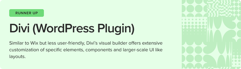 Divi uses a module system to create new blocks on a site. Users can pay for and add custom modules, each of which has extensive customization menus. The learning curve is steeper than Wix, but easier compared to design-heavy tools like Figma or Framer. Other drawbacks include the need to integrate with WooCommerce to add eCommerce features, and the anchoring of web traffic in WordPress plans, since Divi isn’t a hosting site. Similar to Wix, information on offboarding and exporting HTML are not readily available, and it’s hard to find out how to transition to another platform.