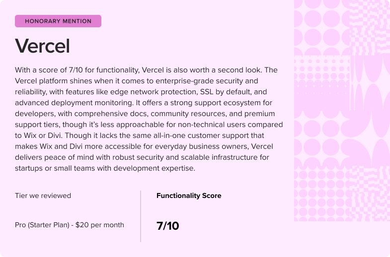In this area, we reviewed the terms of service and other fine print that could hurt—or help—solopreneurs in the long term. We also assessed the true monthly cost to users after years one, two, and five, with any required add-ons or transaction fees. We investigated any channels that are available for support, including live chat, email, phone, AI, and human, and explored their average response times. Finally, we checked whether the tools covered basic DDoS protection, SSL, backups, version history, and other features, or whether those were considered add-ons.