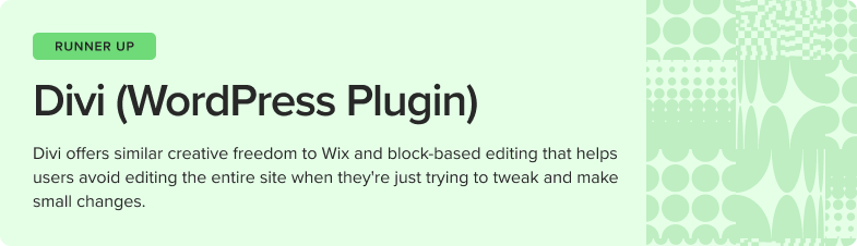 Divi is built on a block-based/modular design grid like Notion, making it simple to use and reducing user error while allowing for some creative flexibility—letting users manually adjust a generated site. However, its many nested menus can make executing on the features a steep learning curve for novice website builders. And while AI suggestions are there, you’ll only see them if you manually prompt the platform for them. Some important features are only available internally; analytics are not built in, and are only available through WordPress. Similarly, the community forum is a gated member area.
