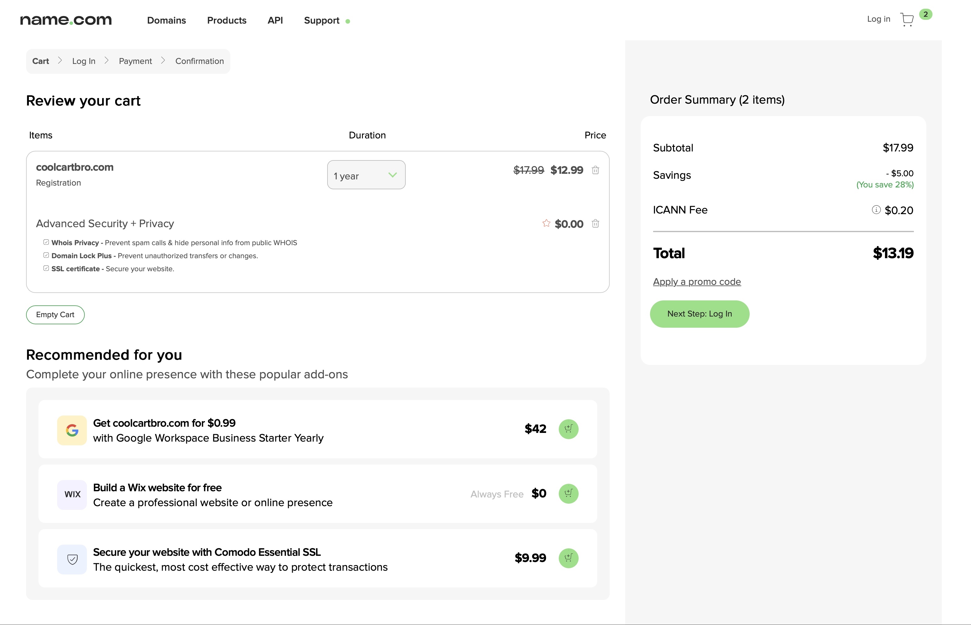 - Sometimes we offer products page called Upgrade your domain experience, where you can add products to your cart or click the button Next Step: Payment/Login.